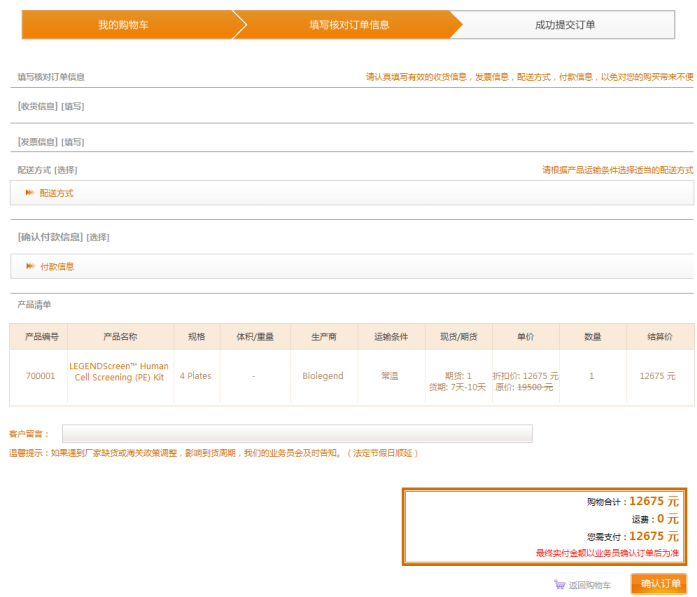 點(diǎn)擊購(gòu)物車頁(yè)面的“結(jié)算”進(jìn)入填寫(xiě)訂單信息的頁(yè)面,在此頁(yè)面請(qǐng)認(rèn)真填寫(xiě),收貨地址、發(fā)票信息、配送方式、支付方式等信息。點(diǎn)擊“確認(rèn)訂單”即可生成訂單。