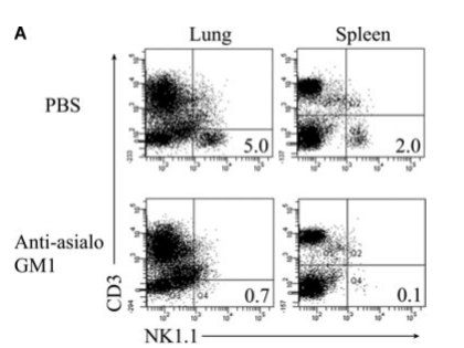文獻來源:Zhou G, et al. 2013. Eur. J. Immunol. 43:929. 該圖顯示尾靜肪注射anti-asialo GM1或PBS,每五天一次,不管是肺還是脾臟,都顯示出NK細胞消耗率。