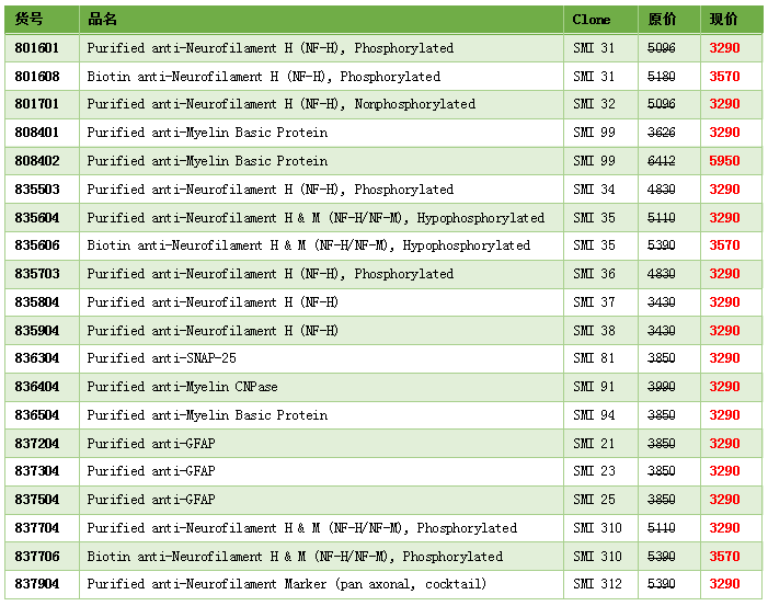 SMI?克隆號系列抗體是BioLegend 旗下品牌 Covance非常重要而知名的產(chǎn)品線,被業(yè)內(nèi)譽為研究神經(jīng)細(xì)胞特異marker的金標(biāo)準(zhǔn)。