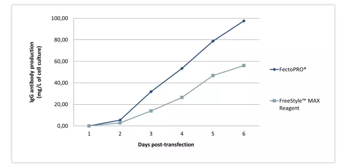 圖1. FectoPRO?大幅提高懸浮CHO細(xì)胞的抗體產(chǎn)量。按1×106個(gè)細(xì)胞/ml的密度將細(xì)胞培育在30ml的無(wú)血清培養(yǎng)基中,并依照每種試劑說(shuō)明書(shū)推薦用量FectoPRO?(0.8 μg DNA/ml)或FreeStyle?MAX試劑(1.25 μg DNA/ml)進(jìn)行轉(zhuǎn)染。用蛋白質(zhì)G生物感應(yīng)器(fortéBIO? octet RED96 system)對(duì)重組小鼠IgG的產(chǎn)量監(jiān)測(cè)1~6天。——ProteoGenix SAS(法國(guó))提供的數(shù)據(jù)。