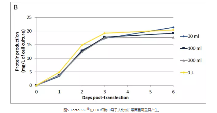 FectoPRO?介導(dǎo)的轉(zhuǎn)染無(wú)需改變流程便可將細(xì)胞培養(yǎng)基按比例從30ml擴(kuò)展至數(shù)升。