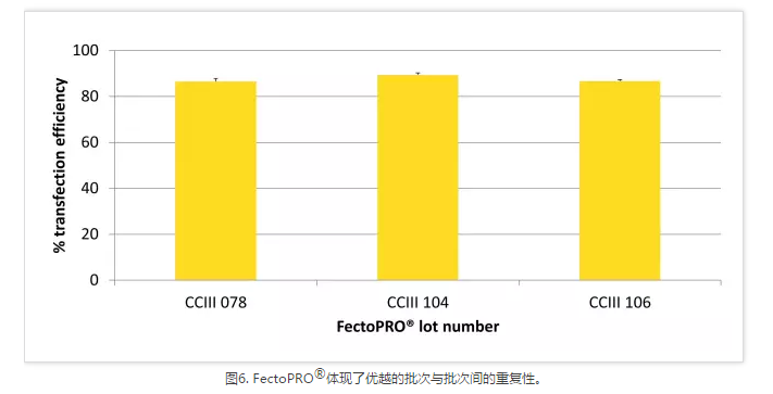 高質(zhì)量質(zhì)粒DNA的制備成本非常高,尤其是在進(jìn)行大規(guī)模蛋白質(zhì)生產(chǎn)時(shí)需要大量的DNA和許多質(zhì)粒。FectoPRO?通過(guò)使用0.4~0.6 μg/106/ml的細(xì)胞培養(yǎng)液將DNA成本縮減了40%~60%,使其成為生物制藥生產(chǎn)流程的一項(xiàng)經(jīng)濟(jì)實(shí)惠的選擇。