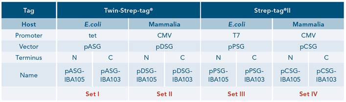 SetⅠ與SetⅡ?yàn)門win-Strep-tag?(三代純化標(biāo)簽),SetⅢ與SetⅣ為Strep-tag?II(二代純化系統(tǒng))標(biāo)簽。每組載體包含兩個1μg帶Amp抗性的載體,分別為Tag在N-Term或C-Term的載體