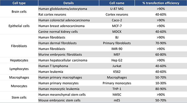 Table 1 jetMESSENGER?可在各種細胞類型中獲得高轉(zhuǎn)染效率