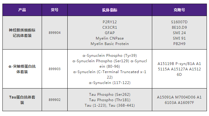 神經(jīng)膠質(zhì)細(xì)胞抗體套裝中包含檢測(cè)常見神經(jīng)膠質(zhì)細(xì)胞的標(biāo)記物,如趨化因子受體1抗體(CX3CR1)、膠質(zhì)纖維酸性蛋白(GFAP)、髓磷脂(Myelin)和嘌呤能受體(P2RY12)。其中的輔助試劑可以檢測(cè)各種屬磷酸化或總α-突觸核蛋白/Tau,這些聚集物與阿爾茨海默癥和帕金森皆有重大關(guān)聯(lián)。