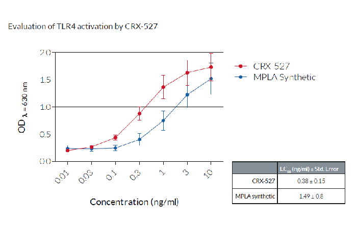將細(xì)胞分別與遞增濃度的CRX-527、合成的單磷酰脂質(zhì)A(MPLA)孵育。在HEK-BlueTM檢測(cè)培養(yǎng)基(SEAP檢測(cè)生長(zhǎng)培養(yǎng)基)中孵育過夜后,通過測(cè)定上清液中是否存在SEAP來評(píng)估TLR4的活化。數(shù)據(jù)表示為OD(λ=630nm)(±SEM)