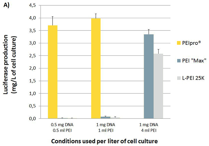 與其它PEIs相比,PEIpro?所需更少轉(zhuǎn)染試劑和較少/相似的DNA用量