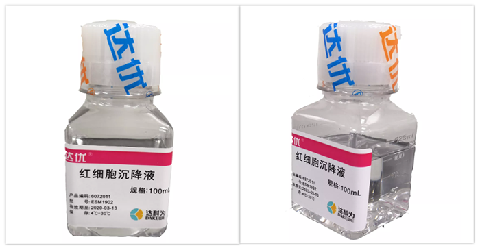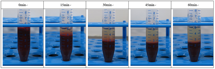 按照4:1的比例加入1mL 紅細胞沉降液,混勻,在室溫自然沉降。結果如下圖所示。