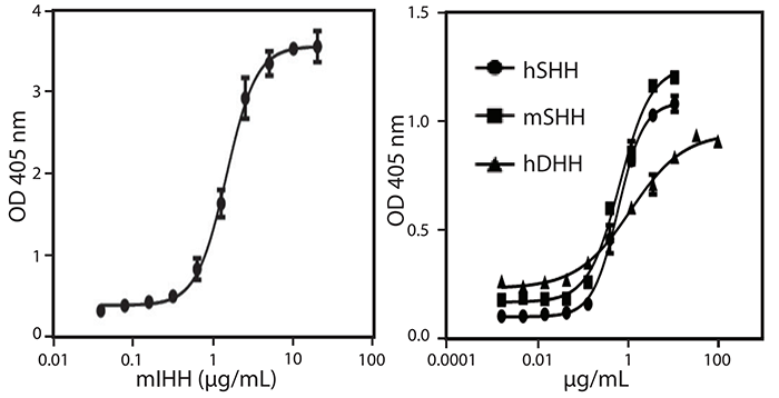 C3H10T1/2干細胞培養(yǎng)至細胞融合,使用BMP-9(20 ng/mL, Cat. No. 553102)和不同濃度的h/mSHH、或hDHH、或mIHH(Cat. No. 753502, 754602, 759802,758602)處理,將間充質干細胞誘導分化為成骨細胞。使用對硝基苯磷酸酯作為底物,檢測成骨細胞標記物堿性磷酸酶。