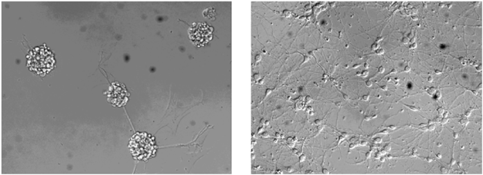人Midkine增強了培養(yǎng)三天的大鼠胚胎(E18)皮層神經元的神經突起生長;左(未處理),右(0.4 μg/mL的人Midkine)