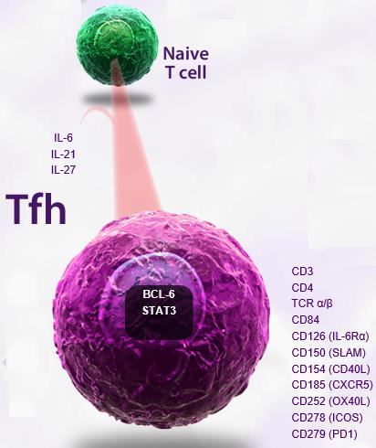 主要標(biāo)記物:Tfh 細(xì)胞屬于 CD4+ T 細(xì)胞亞群,其表型特征為 CXCR5+CD40LhiICOShi ,并且還表達(dá)細(xì)胞因子 IL-21 和轉(zhuǎn)錄因子 Bcl-6 。 IL-21 和 Bcl-6 ( B-cell lymphoma 6 )對(duì)于 Tfh 細(xì)胞的發(fā)生和發(fā)育至關(guān)重要。其中 IL-21 誘導(dǎo) Tfh 的分化并促進(jìn)其表面 CXCR5 的表達(dá); Bcl-6 對(duì)于 Tfh 轉(zhuǎn)移到淋巴濾泡和 B 細(xì)胞發(fā)生中心( Germinal center )的形成必不可少。