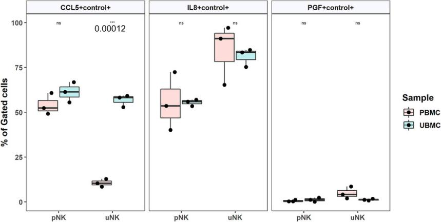 與外周血白細(xì)胞相比,胎盤床樣品中的CD16-CD56++NK細(xì)胞明顯表達(dá)更高的CCL5 mRNA(圖4)。另一方面,胎盤床和外周血中CD16+CD56++細(xì)胞表達(dá)的RANTES mRNA水平相似。此外,在胎盤床和外周血樣本中,兩種NK細(xì)胞中IL8和PGF mRNA水平均無差異。