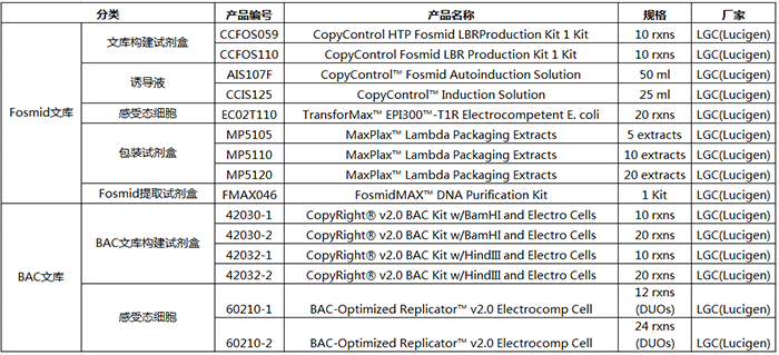 另外,LGC(Lucigen)還提供Fosmid提取試劑盒、Lambda包裝提取物、誘導(dǎo)液等配套產(chǎn)品。如果您對BAC文庫感興趣,也可以了解下LGC(Lucigen) 公司的CopyRight? v2.0 BACKit,該克隆試劑盒可插入200kb DNA片段,并且可誘導(dǎo)單拷貝至高拷貝,獲得高產(chǎn)量的DNA。
