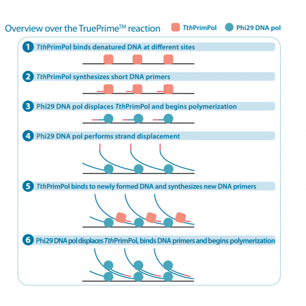 TruePrime?采用MDA技術(shù),基于新型的TthPrimPol 引物酶和Phi29 DNA聚合酶,擴增過程無需添加隨機引物,減少了擴增偏倚,提高了擴增過程的覆蓋率和保真性,并且對于污染的外源DNA不敏感,可重復性好。TruePrime?可用于單個細胞或少量細胞的全基因組擴增,與常見的NGS平臺如Illumina和IonTorrent等兼容性良好。