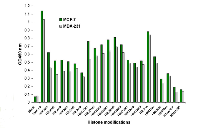 該試劑盒檢測H3修飾位點:H3K4me1 、H3K4me2、H3K4me3、H3K9me1、H3K9me2 、H3K9me3、H3K27me1、H3K27me2、H3K27me3、H3K36me1、H3K36me2、H3K36me3、H3K79me1、H3K79me2、H3K79me3、H3K9ac、H3K14ac、H3K18ac、H3K56ac、H3ser10P、H3ser28P、TotalH3