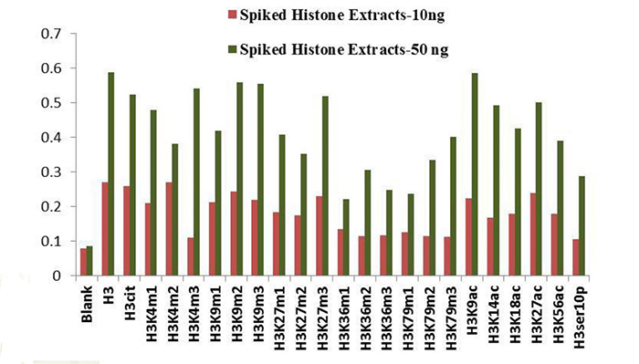 該試劑盒檢測H3修飾位點:H3K4me1 、H3K4me2、H3K4me3、H3K9me1、H3K9me2 、H3K9me3、H3K27me1、H3K27me2、H3K27me3、H3K36me1、H3K36me2、H3K36me3、H3K79me1、H3K79me2、H3K79me3、H3K9ac、H3K14ac、H3K18ac、H3K27ac、H3K56ac、H3ser10P、H3cit、TotalH3