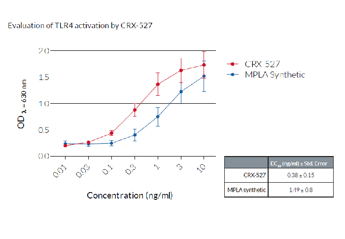 將細(xì)胞分別與遞增濃度的CRX-527、合成的單磷酰脂質(zhì)A(MPLA)孵育。在HEK-BlueTM檢測(cè)培養(yǎng)基(SEAP檢測(cè)生長(zhǎng)培養(yǎng)基)中孵育過夜后,通過測(cè)定上清液中是否存在SEAP來(lái)評(píng)估TLR4的活化。數(shù)據(jù)表示為OD(λ=630nm)(±SEM)