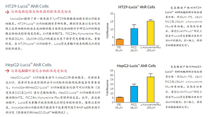 InvivoGen提供兩個AhR報告細胞系,分別改造自人HT29結(jié)腸腺癌和HepG2肝癌細胞系。HT29-Lucia?AhR細胞和HepG2-Lucia? AhR細胞有助于研究AhR激活作用,可以幫助了解多種激動劑如外源物質(zhì)和飲食衍生的吲哚產(chǎn)物對AhR的激活反應。最重要的是,我們的AhR報告細胞是人源細胞,并且內(nèi)源性表達人AhR,這使得它們與人類樣本中篩選內(nèi)源性AhR激動劑高度相關(guān)。