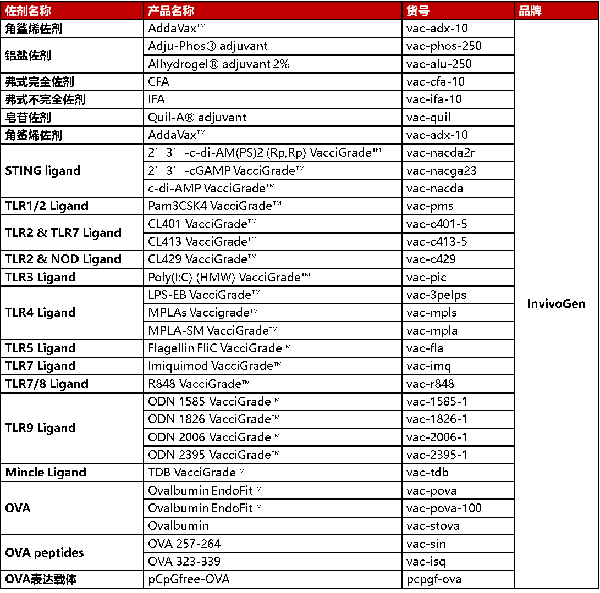 當(dāng)前,針對(duì)COVID-19的疫苗研發(fā)以前所未有的速度在世界范圍內(nèi)陸續(xù)開展,世界各地的科學(xué)家正在探索開發(fā)針對(duì)SARS-CoV-2的有效疫苗的所有潛在策略。大多數(shù)用于COVID-19的候選疫苗旨在誘導(dǎo)針對(duì)病毒S蛋白的中和抗體,防止病毒通過人ACE2受體攝取從而阻止感染。COVID-19疫苗開發(fā)前景的顯著特征是正在評(píng)估的技術(shù)平臺(tái)的多樣性,包括:減毒活疫苗,基于病毒載體的疫苗,基于重組蛋白的疫苗,DNA疫苗和RNA疫苗。其中重組蛋白疫苗通常使用SARS-CoV-2蛋白(例如S蛋白)在宿主中引起免疫反應(yīng)。通常與佐劑結(jié)合使用以提高免疫原性。迄今為止,已進(jìn)入臨床試驗(yàn)的COVID-19候選疫苗包括Moderna開發(fā)的mRNA疫苗(NCT04283461)和康希諾 (NCT04341389)開發(fā)的重組腺病毒疫苗。此外,諸如AS03和MF59等佐劑正在重組蛋白疫苗中進(jìn)行探索,使用佐劑可增強(qiáng)免疫原性并降低劑量,使更多人接種疫苗成為可能。天然免疫專家InvivoGen提供科研用途的佐劑和OVA產(chǎn)品供研究人員選擇。